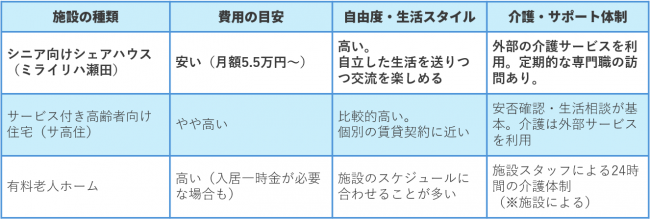 ■ シニア向けシェアハウスと、他の高齢者向け施設との違い