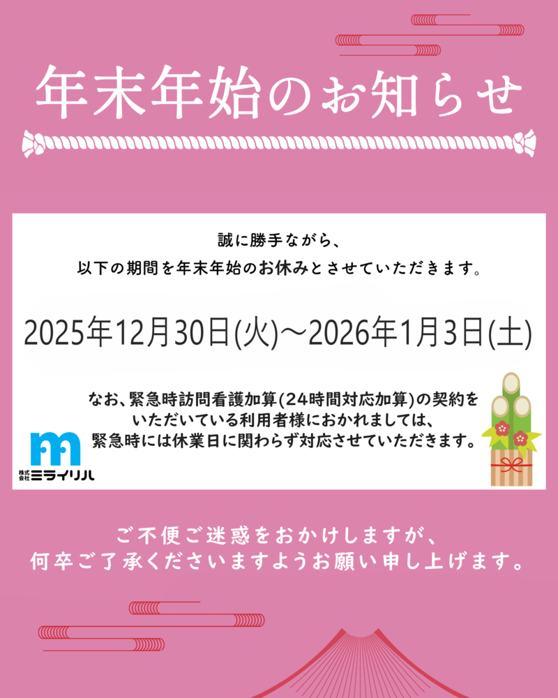上記の期間中も、緊急時訪問看護加算(24時間対応加算)をご契約いただいている利用者様におかれましては、休業日にかかわらず緊急時に対応させていただきますのでご安心ください。