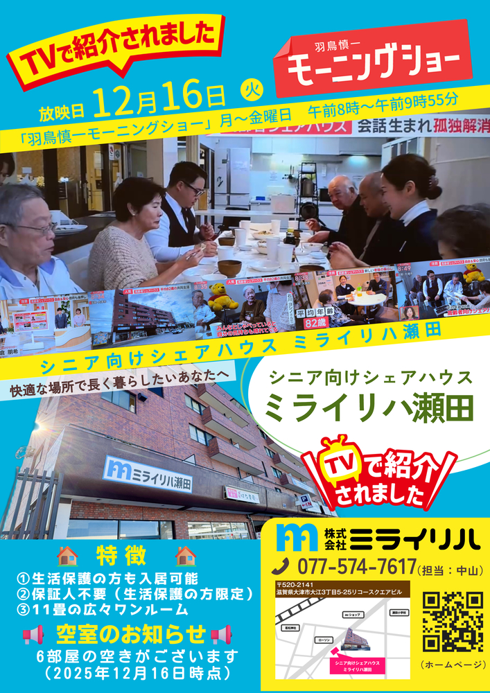 本日、12月16日(火)放送のテレビ朝日系列『羽鳥慎一モーニングショー』にて、私たちが運営する「シニア向けシェアハウス ミライリハ瀬田」が紹介されました!