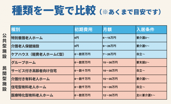 1. 【一覧表】4つの民間施設の違いと費用相場