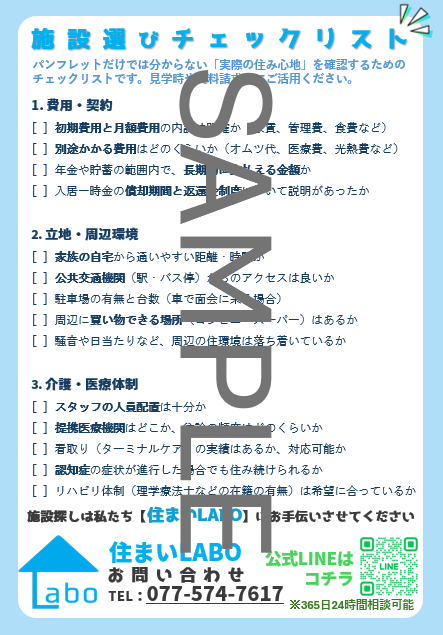 見学時に持参してそのまま書き込める、住まいLABOオリジナルの「施設選びチェックリスト(PDF)」をご希望の方に無料でプレゼントいたします。